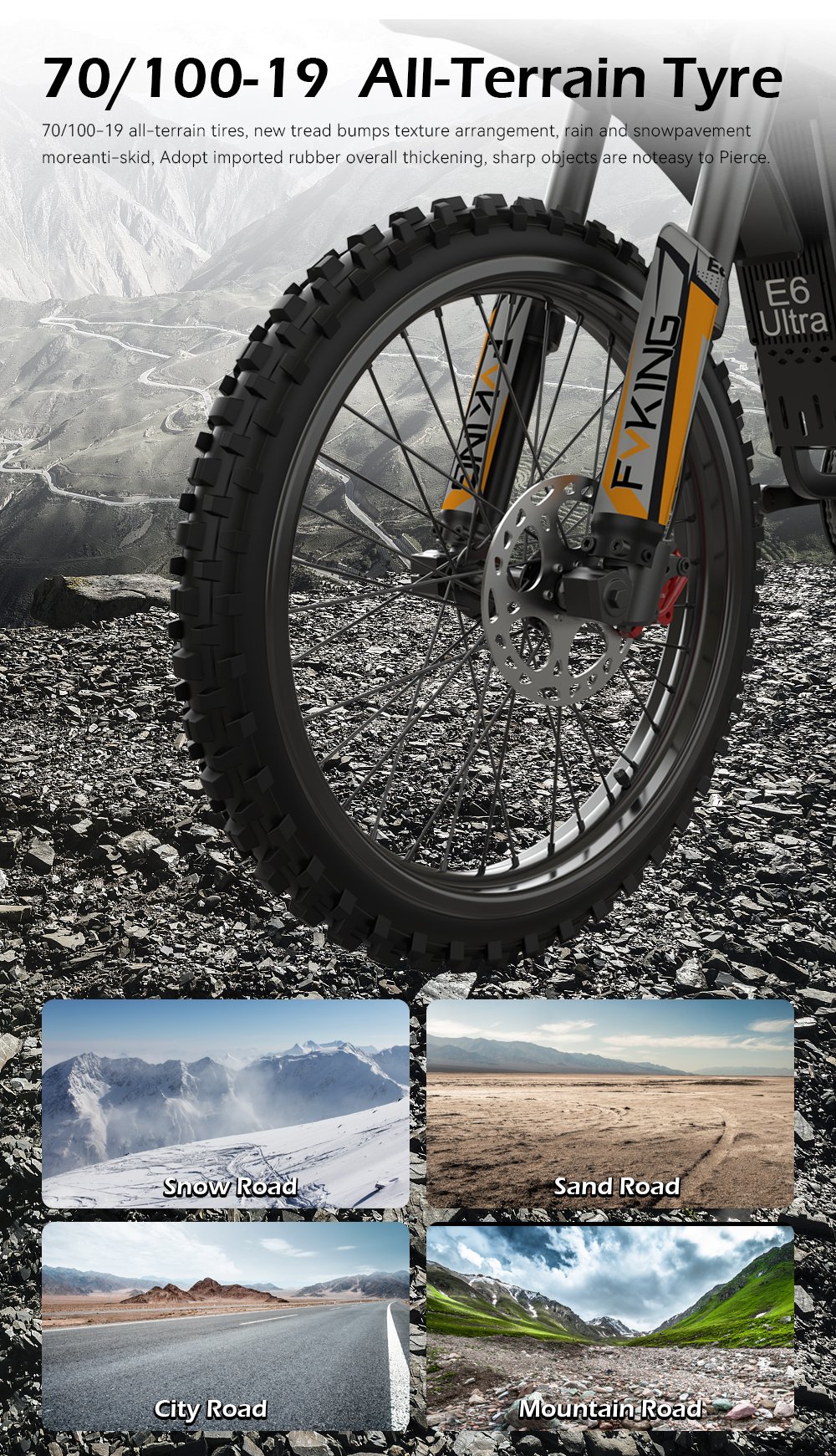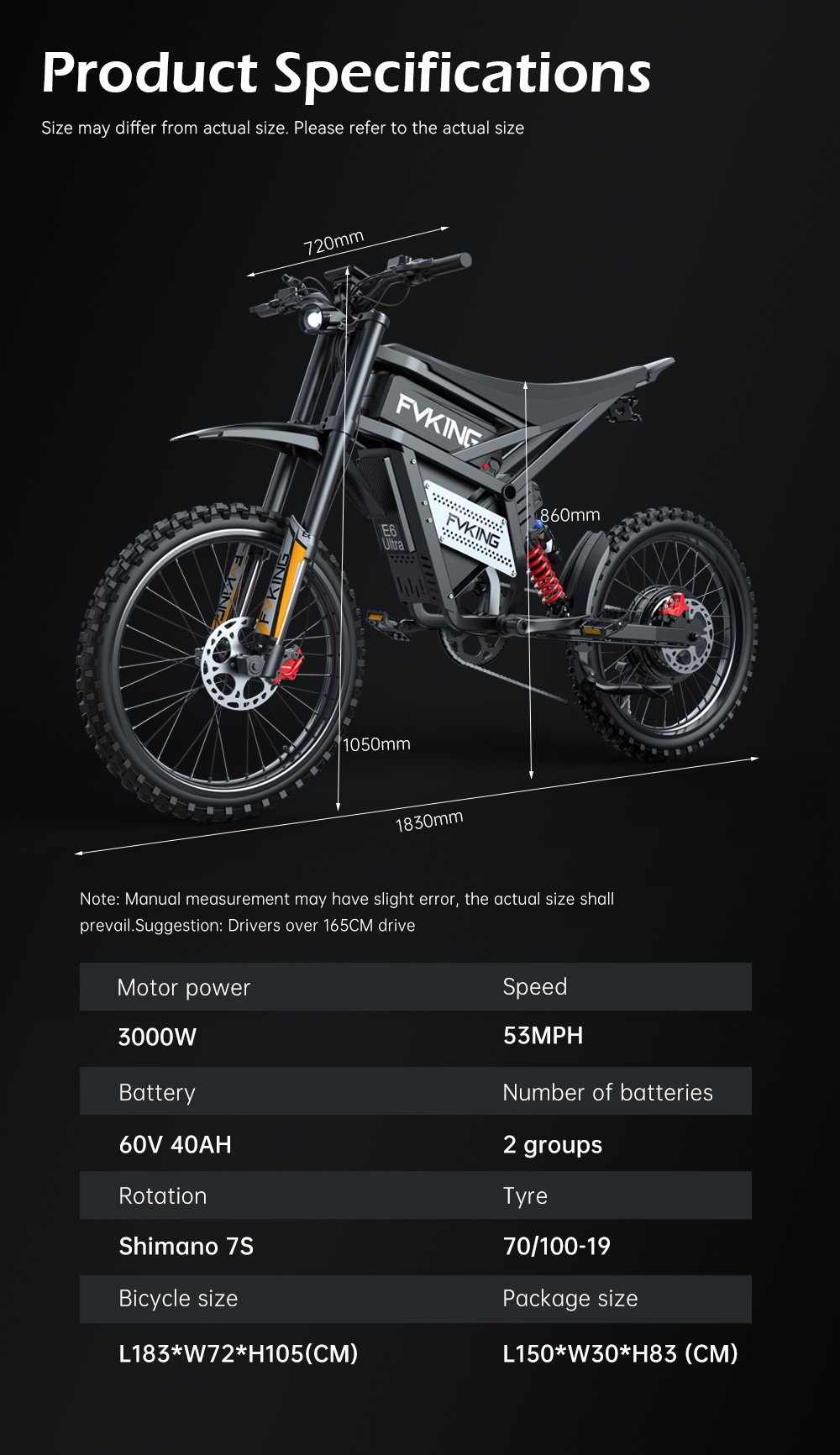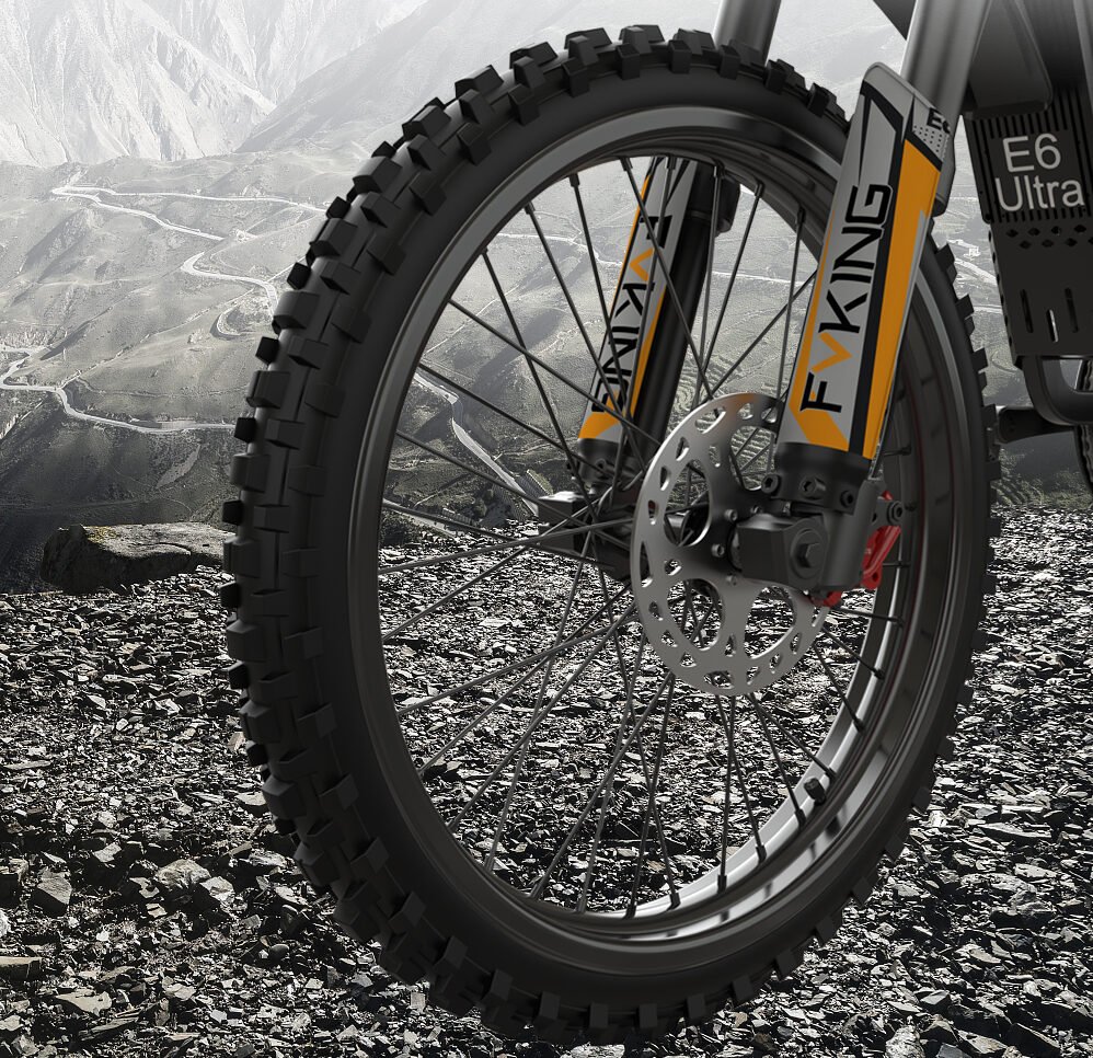 The FVKING E6Ultra is a high-performance electric dirt bike designed to deliver a pulse-pounding riding experience. Powered by a 3000W motor, a 60V 30Ah battery pack, and a top speed of 53 mph, this electric vehicle demonstrates exceptional performance with a maximum range of up to 55 miles. Equipped with a full suspension system, hydraulic brakes, and 19-inch off-road tires, it ensures a comfortable and stable ride across any terrain. Suitable for riders between 5’5″ and 6’5″ in height with a maximum load capacity of 330 lbs, the FVKING E6Ultra is a versatile and ideal choice for outdoor enthusiasts.